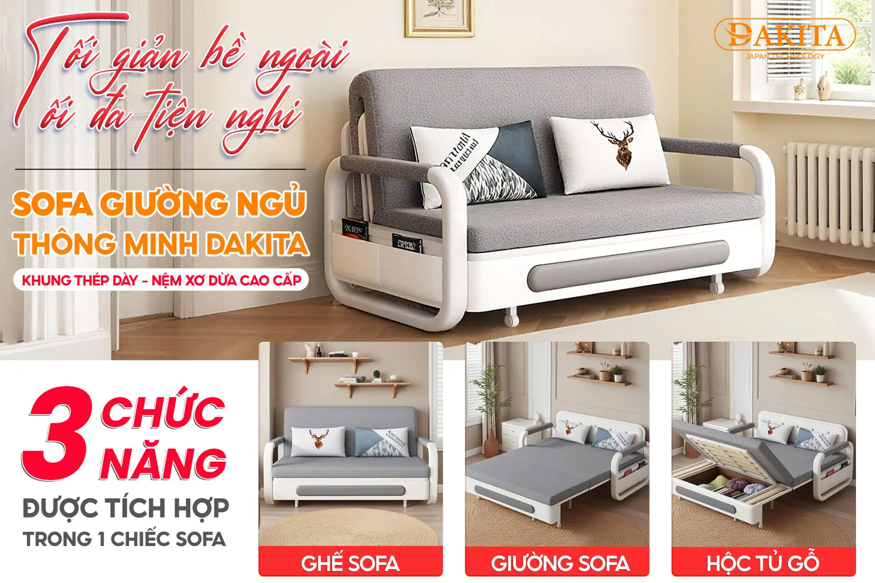 -45%[Nệm Xơ Dừa Cao Cấp + Hộc Tủ Gỗ + Thép Tốt ] Sofa Kéo Thành Giường Thông Minh Nhập Khẩu Cao Cấp Thương Hiệu DAKITA